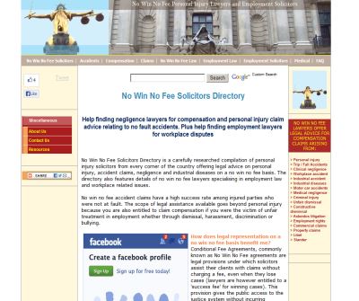 Site features personal injury lawyers working on a no win no fee basis. Includes search features enabling visitors to locate injury lawyers by city or county.