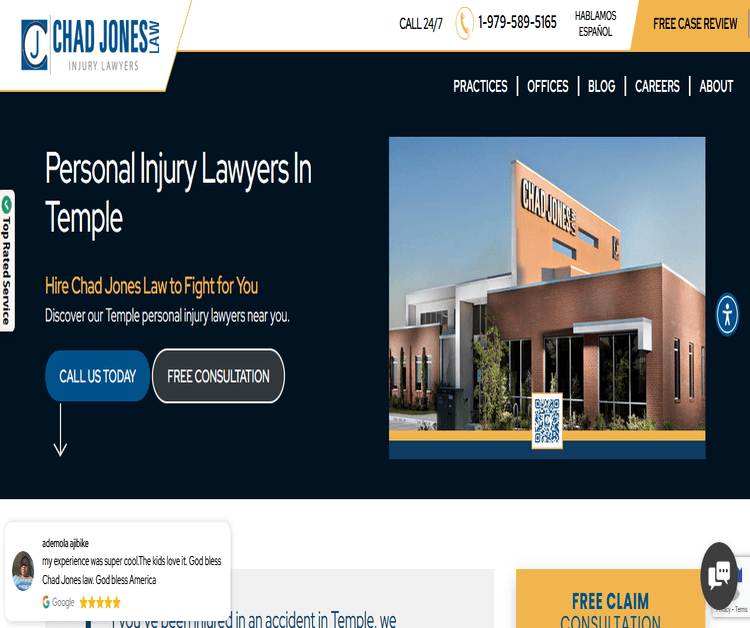 Chad Jones Law stands as the premier choice for personal injury representation in Temple, Texas. With a legacy of more than eight decades of combined legal experience, our seasoned attorneys bring a proven track record of securing substantial settlements and verdicts for injured Texans. Our dedicated Temple office, located at 114 E Central Ave Suite 120, offers clients a welcoming environment where every case is handled with the utmost professionalism and compassion.