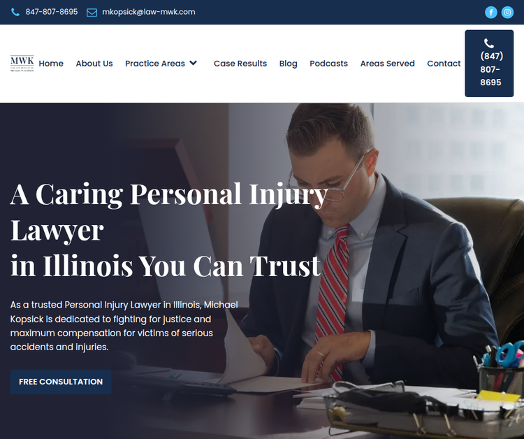 The Law Offices of Michael W. Kopsick are a premier personal injury law practice located in Waukegan, Illinois. With over two decades of experience, the firm has built a reputation for unwavering dedication to clients who have suffered injuries due to negligence, wrongful acts, or defective products. Our attorneys specialize in securing maximum compensation for medical bills, lost wages, pain and suffering, and future care costs. Every case is handled with meticulous attention, ensuring that the legal process is transparent and the client remains informed at every stage.