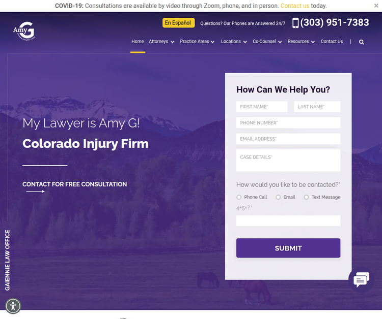 At Amy G Injury Firm, we fight to ensure that accident victims are taken care of. Colorado state law allows accident victims who were hurt due to someone else's negligent, reckless, or intentional misconduct to sue the responsible party. If you recently suffered an injury caused by someone else's actions (or inaction), contact a Denver personal injury lawyer today. Phone: (303) 557-6981 Hours: 24 hours, 7 days a week