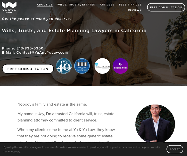 Yu %38 Yu Law is a California-based estate planning law firm led by attorney Jay Yu, specializing in personalized will, trust, and estate planning services for individuals and families of all backgrounds, offering custom-tailored solutions with direct attorney access and flat-rate pricing to protect assets and avoid probate.