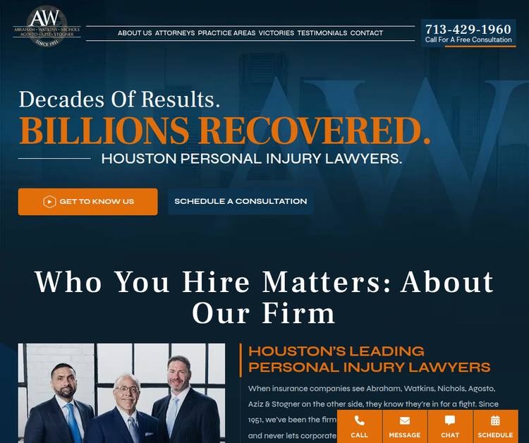 Founded in 1951, Abraham, Watkins, Nichols, Agosto, Aziz & Stogner has stood as a pillar of the Houston legal community for over seven decades. Our firm began with a simple mission: to fight for injured Houstonians who faced powerful insurance corporations and corporate giants. Over the years, we have expanded our reach, but our core values—integrity, tenacity, and personalized client care—remain unchanged. We are proud of the deep roots we have planted in the city, working with countless families and individuals who have trusted us to defend their rights and secure the compensation they deserve.
