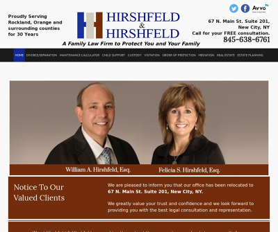 Hirshfeld & Hirshfeld have been serving families in Rockland and Orange counties for more than 30 years, providing efficient assistance in real estate, state planning and divorce with a comprehensive approach and professionalism that all our clients deserve.Our services: Divorce/Separation, Maintenance Calculator, Child Support, Custody, Visitation, Order of Protection, Mediation, Real Estate, Estate PlanningIf you need assistance with these or other business legal issues, contact Hirshfeld & Hirshfeld today to schedule your consultation.Hirshfeld & Hirshfeld 120-126 North Main Street, Annex Building New City, New York 10956 Phone: 845-638-6761Email: whirshfeld@gmail.comEmail: felhirshfeld@gmail.comWebsite: http://hirshfeldandhirshfeld.comLike Us on Facebook: https://www.facebook.com/hirshfeldlawFollow Us on Twitter: https://twitter.com/HirshfeldHir