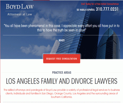 Boyd Law family and divorce law firm based out of Los Angeles, CA website providing information on the firm''s practice areas, contact us information, physical address and phone number, case results, client testimonials, attorney bio pages, and more.