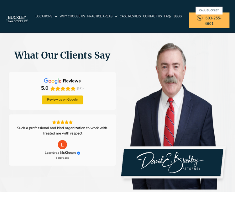 Buckley Law Offices, P.C. is your premier personal injury law firm serving all of New Hampshire and beyond. With over 200 five-star reviews, our dedication to client satisfaction is unmatched. Led by Attorney David E. Buckley, a member of the Multi-Million Dollar Advocates Forum and an AAJ State Delegate, we handle bus accidents, motorcycle accidents, truck accidents, workplace injuries, brain injuries, dog bites, slips and falls, and more. Recognised as the Best Personal Injury Law Firm (2021-2023), we monitor clients' medical care for quicker recoveries and higher settlements. Whether you're a resident or visiting from out of state, trust us for your legal representation. Call Buckley today to discuss your personal injury needs.