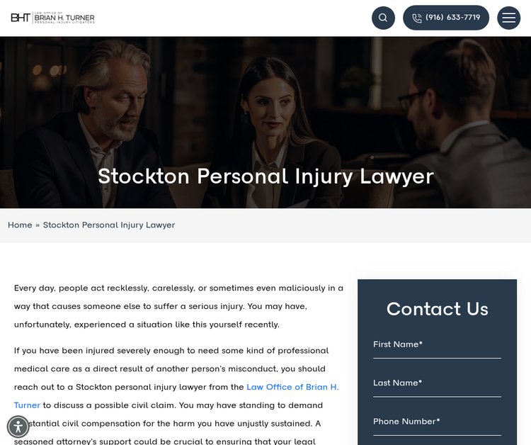The Law Office of Brian H. Turner is a personal injury law firm with an office in Stockton, California and serving throughout the state since 2015, with over 60 years of shared legal experience. We handle cases such as trucking accidents, catastrophic injuries, auto accidents, bicycle accidents, and more. If you have been injured due to someone else's negligence, contact our office today for a free consultation. Hours: Open 24 hours