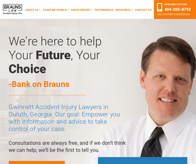 Brauns Law Accident Injury Lawyers, PC is a personal injury law firm headquartered in Gwinnett County - Duluth, GA. It''s founding personal injury lawyer David Brauns is a nationally recognized car accident lawyer with deep expertise handling car accident injury cases. We represent people injured in a variety of situations: motor vehicle (e.g., car, truck, taxi, Uber, Lyft, bus, bicycle, motorcycle, etc.) or pedestrian accidents, brain injury, slip-and-fall, trip-and-fall, dog bite, and burn injury, as well as wrongful death and workers'' compensation. Call us or contact us today for your free consultation.