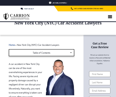 A car accident in New York City can be an overwhelming experience in your life. There are severe injuries and property damage caused by a negligent driver that can flip your life upside down. You want to ensure everything is taken care of soon after your crash. However, after an accident, achieving peace of mind can be a nightmare, especially when dealing with New Yorks complex insurance and personal injury liability laws. Our New York City car accident lawyers from Carrion Accident & Injury Attorneys can fight for financial compensation and work to bring those responsible to justice.