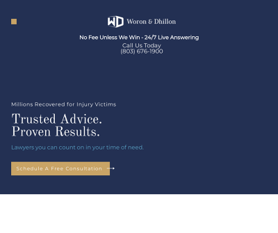 Woron and Dhillon, LLC is a personal injury law firm that serves clients throughout the Columbia, SC area. Their areas of practice include car accidents, catastrophic injuries, drunk driving accidents, dram shop law, motorcycle accidents, premises liability, truck accidents, and wrongful death. The attorneys of Woron and Dhillon, LLC provide free consultations in both English and Spanish. Following your initial case evaluation, their legal team will work with you directly. They visit clients in the hospital and in their homes while they recover from their injuries.Woron and Dhillon, LLC has handled thousands of cases.